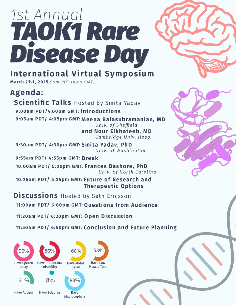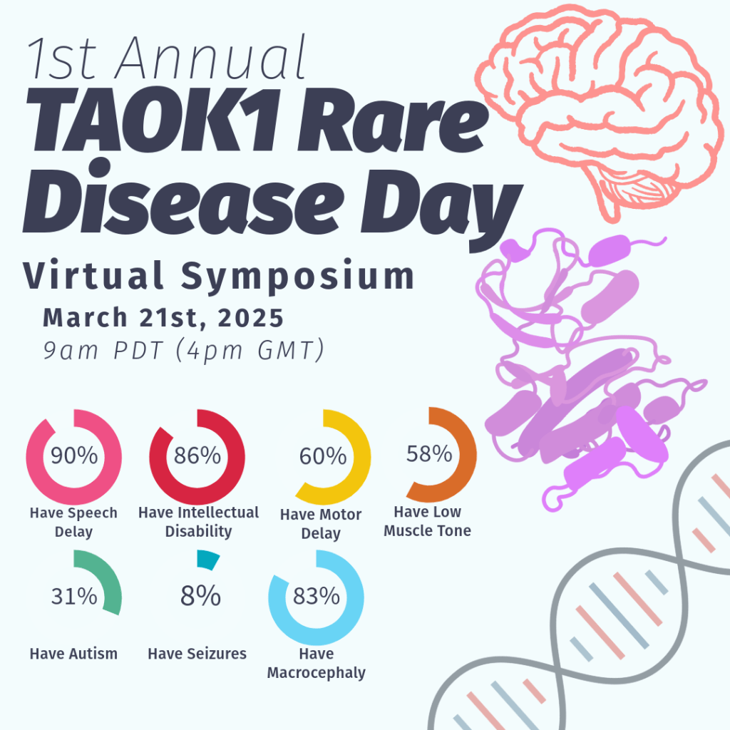 We are organizing a virtual symposium on March 21, 2025 to bring together families affected by TAOK1 mutations, TAOK1 researchers and clinicians to discuss the current state of TAOK1 research and future opportunities. Please register here: